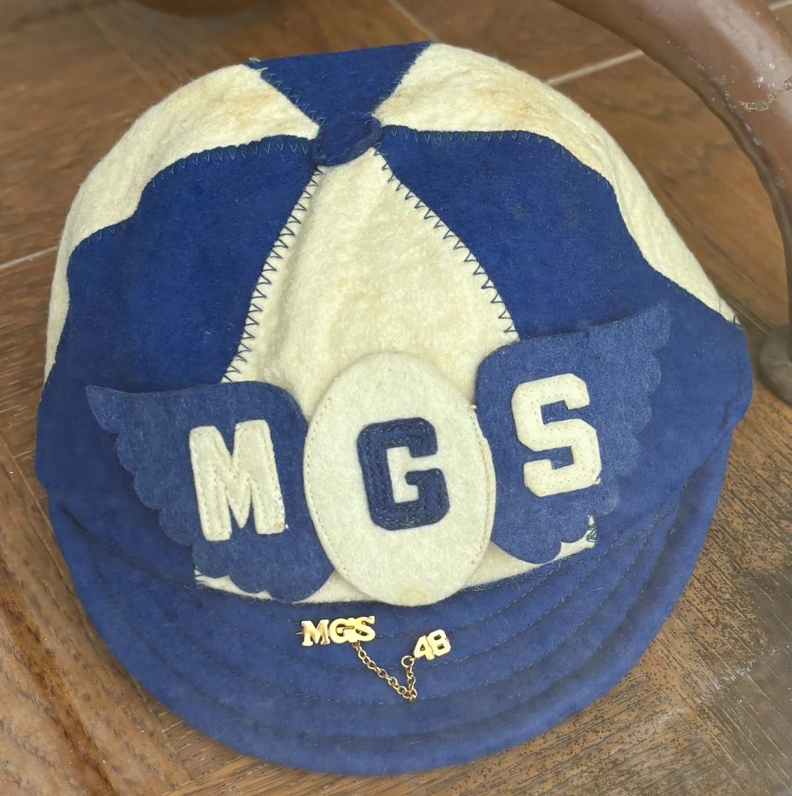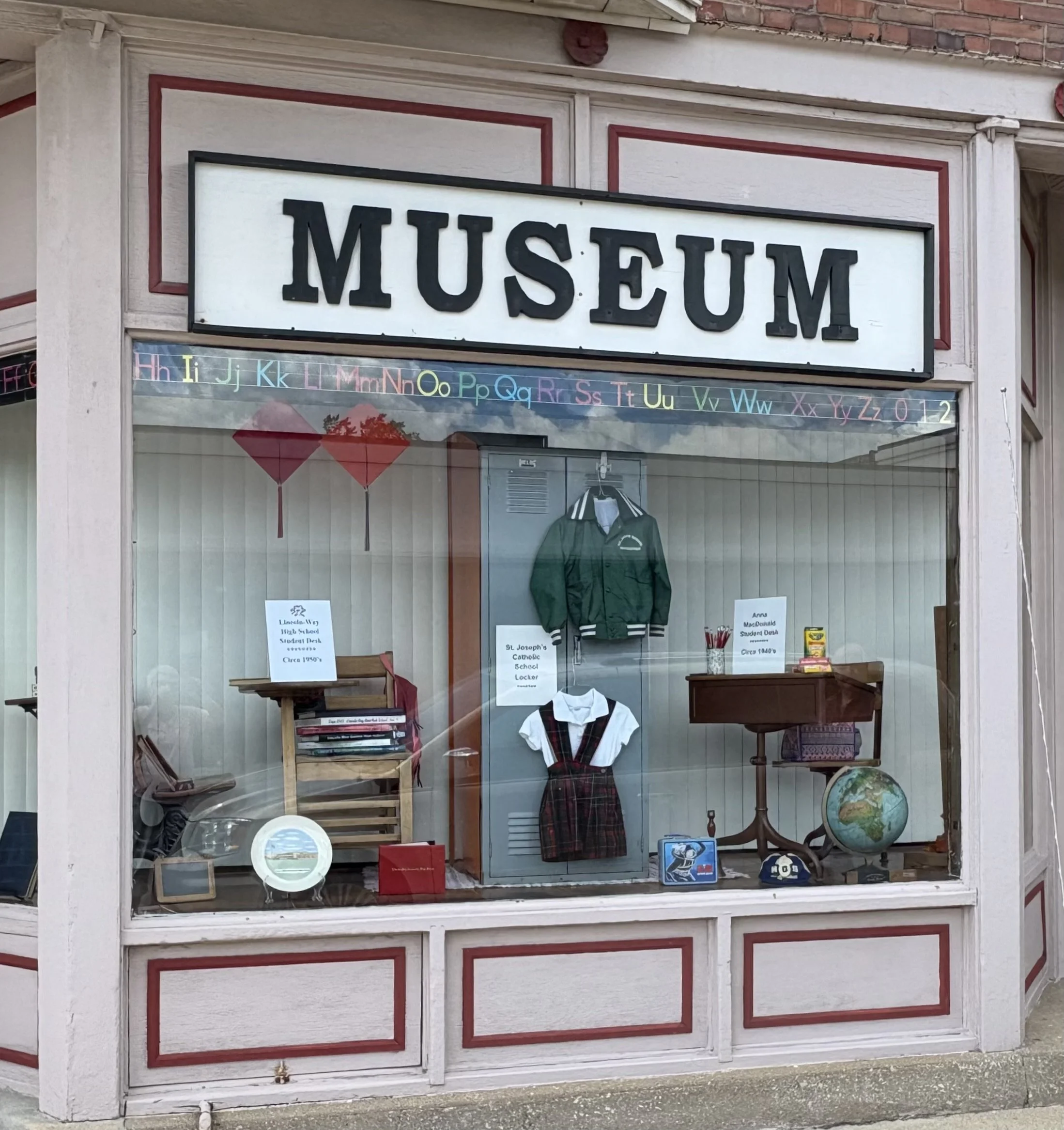 Student desk used in one-room schools (undated); Manhattan Grade School beanie (1948) belonging to Marilyn Boyle; St. Joseph Catholic School’s locker, uniform and uniform jacket; an abacus used in Anna MCDonald School; original student desk from Lincoln-Way Community High School, ca. 1950; original student desk from Anna McDonald School, ca. 1940s.