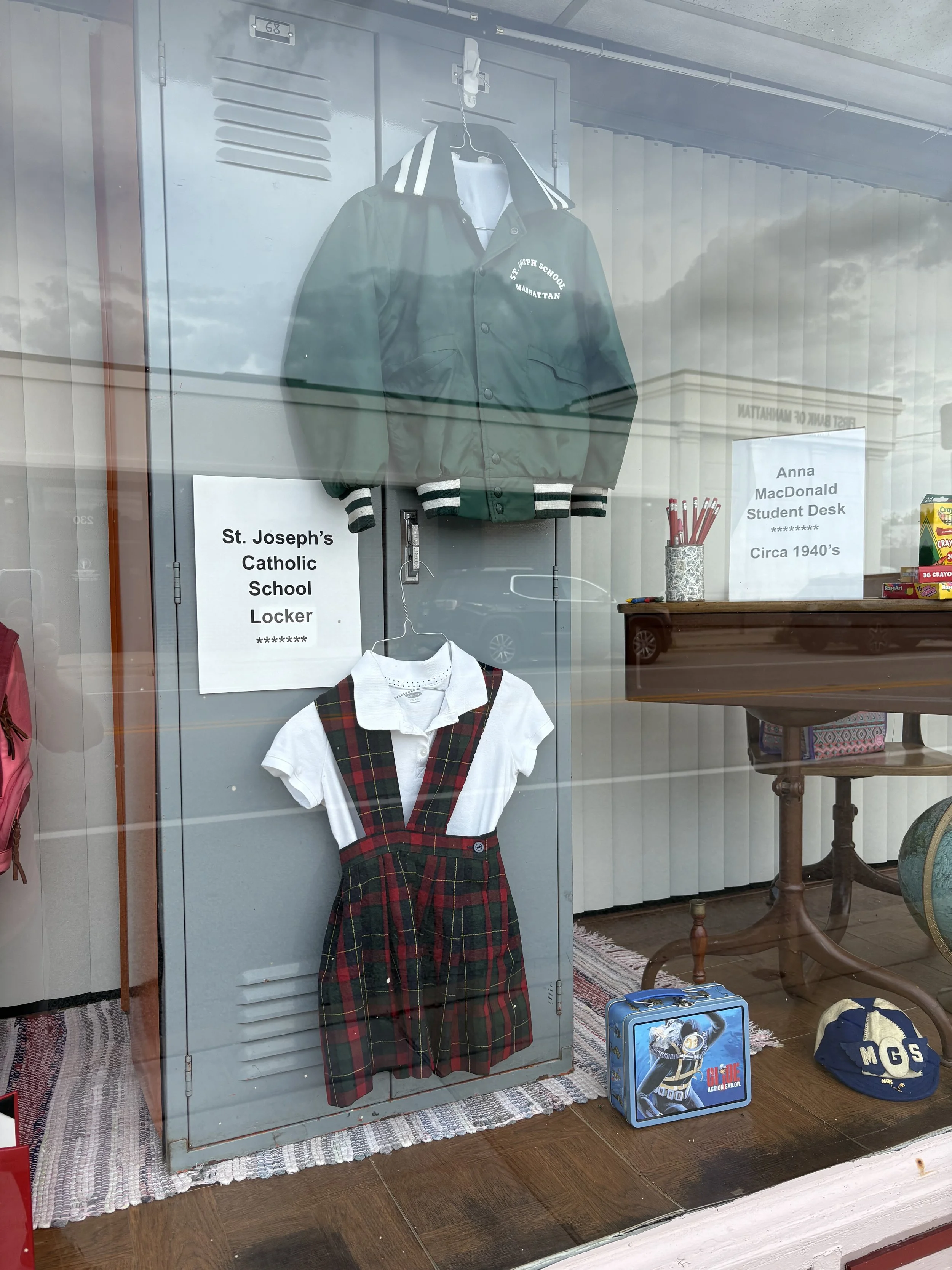 Another part of “museuming” is the creation of window displays. Our window displays have often reflected the theme of our on-going exhibit. We have taken part in a few window display contests created by the Manhattan Chamber of Commerce. The window now celebrates the 10th Anniversary of the Museum. Our volunteers are always thinking of and creating future exhibits and presentations. Our primary goal is to learn and share as much as possible with our visitors. We welcome suggestions for future exhibits, displays, and presentations.